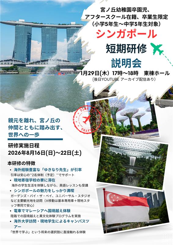 シンガポール短期研修プログラム実施のお知らせ(宮ノ丘幼稚園卒園児・アフタースクール在籍生・卒業生限定、小学5年生~中学3年生対象)