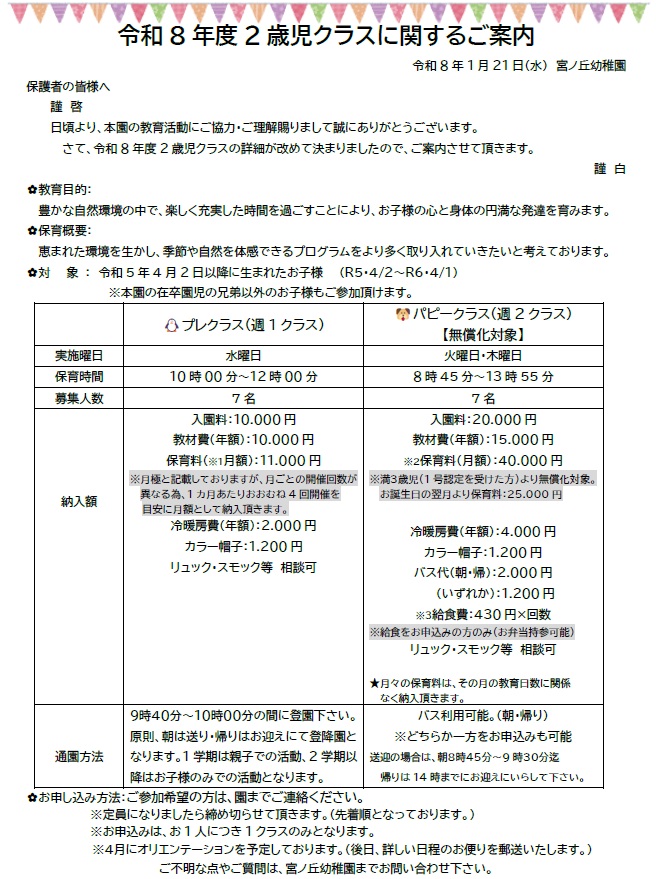 2026年度新設 週2回【火曜・木曜】登園の2歳児クラスについてのご案内